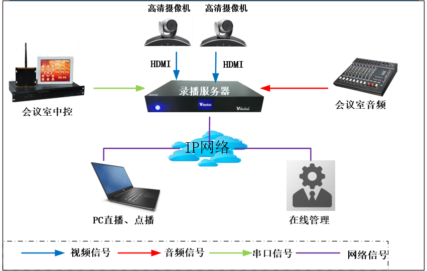 現在有的視頻會議室錄播解決方案,基本上是用硬盤錄像機、模擬錄播等設備對視頻議終端的輸出進行二次編碼來實現的,其缺點是二次編碼圖像和音頻效果都會差,而且接線復雜,終端本身不具備輸出本地音頻的功能,需要額外添加音頻設備. 錄制管理復雜, 每次都要進行開始錄制的管理。