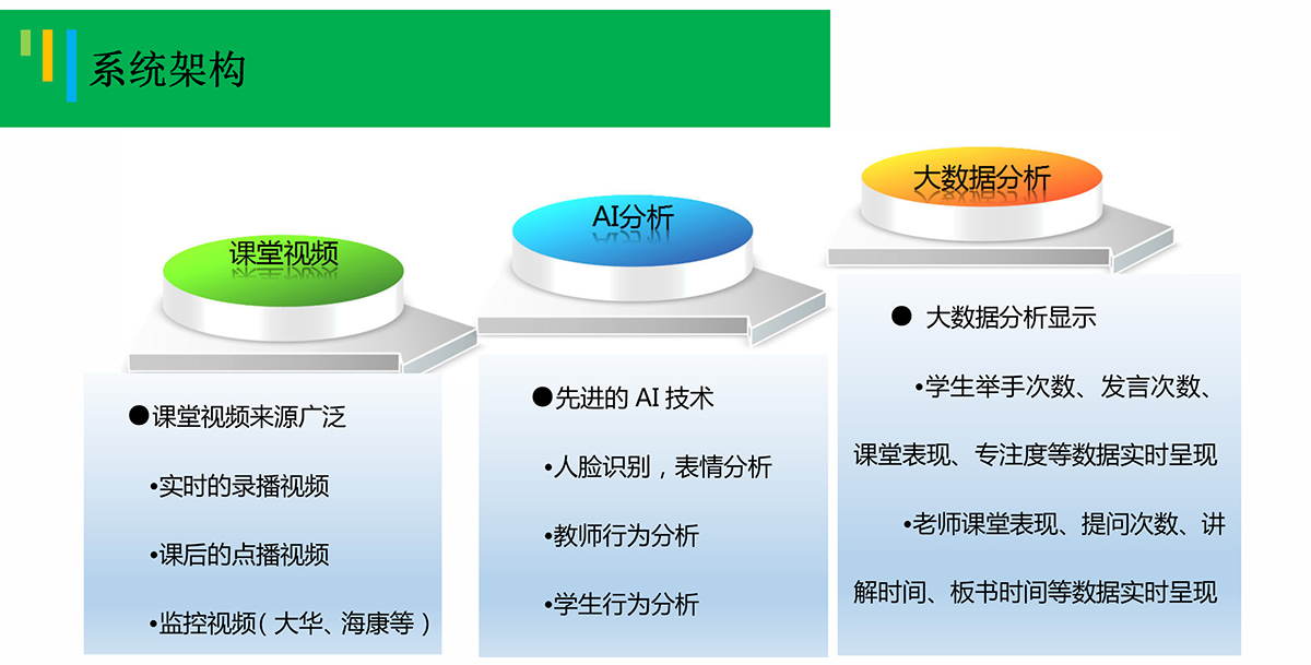 AI學情分析系統采用前端采集后臺分析的方案,前端教室可對接高清監控攝像機,如大華、宇視、天地偉業等,無需專業考勤攝像機,學生攝像機基礎要求:視場角120度,分辨率:4k,支持攝像機復用和利舊。 AI學情分析系統也支持對接常態化錄播系統,提供定制化解決方案,可直接對接錄播主機,實現圖像傳輸和分析。