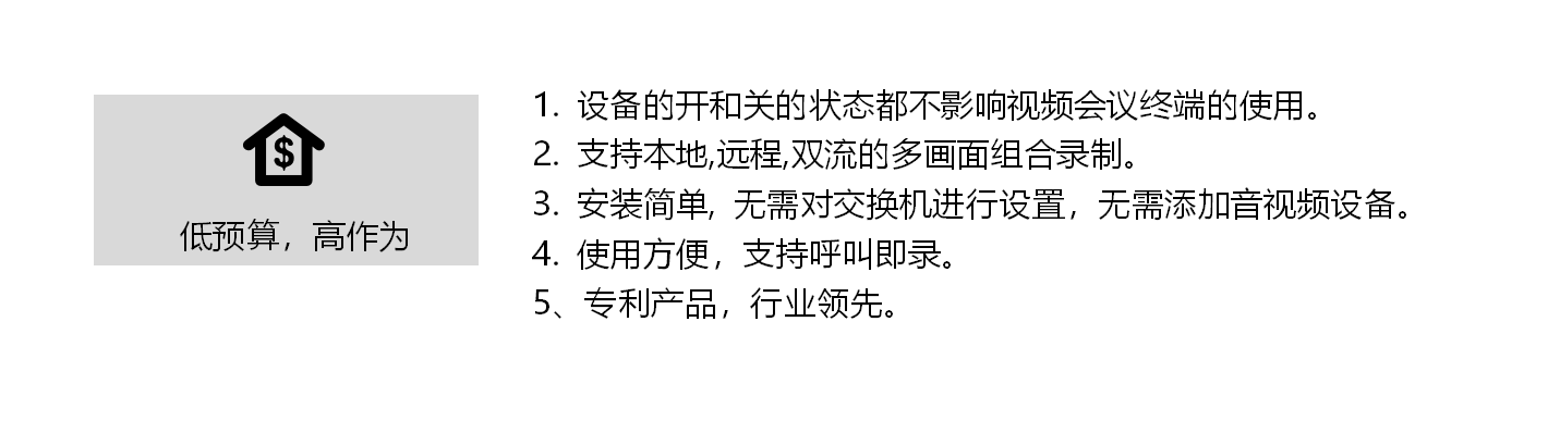 · 系統獨立:物力和邏輯單元獨立,不占用用戶網絡資源,對用戶網絡不會造成任何不良影響,不占用MCU的資源,不會對原有視頻會議系統產生影響,可以配合任何廠商的視頻會議系統,不需要對原有設備做任何修改。