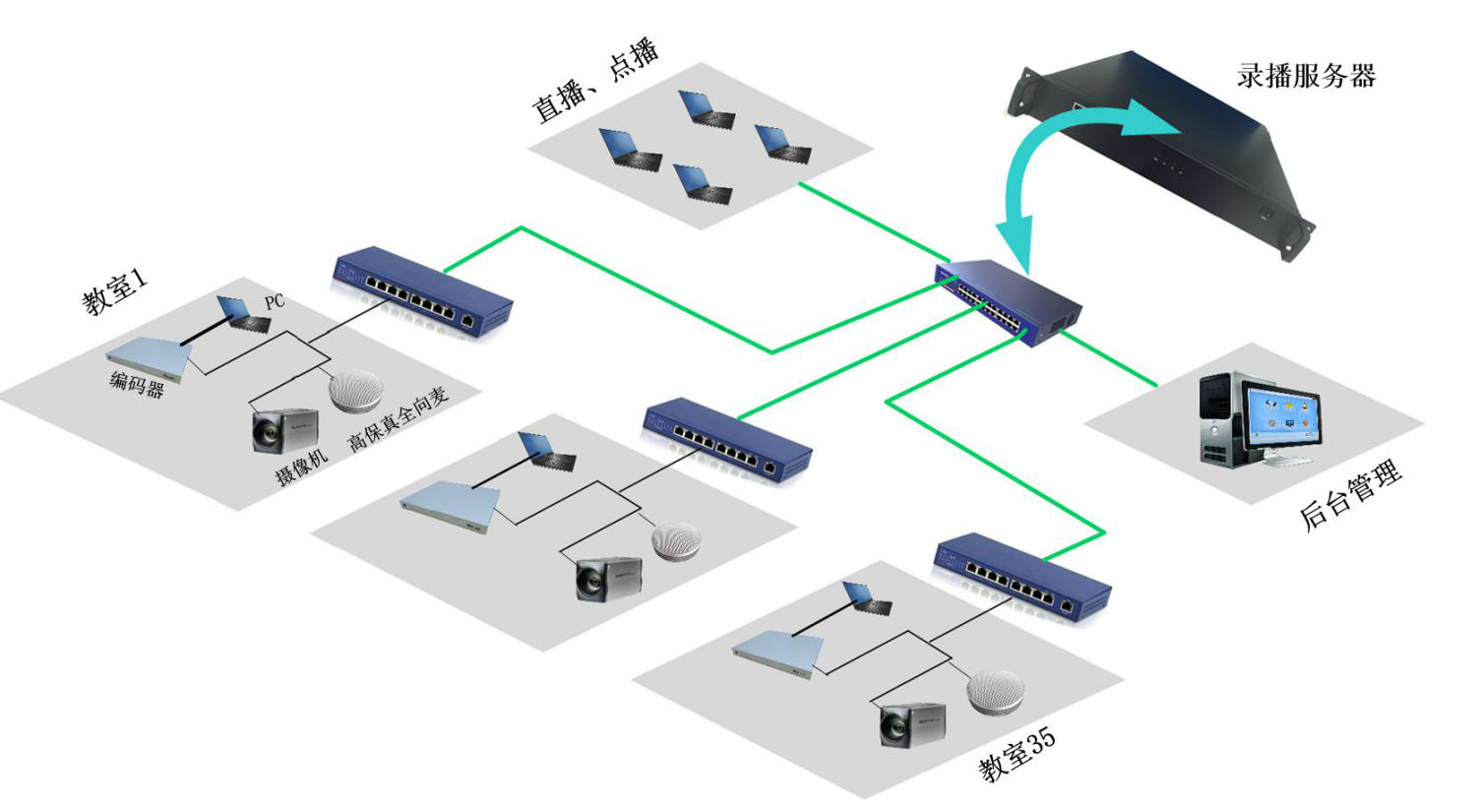 · 實時直播:錄播服務器連接前端高清編碼器后可將前端教室畫面通過校園網實時直播到各教室中,教室內電腦通過輸入錄播服務器ip地址的方式進行訪問。