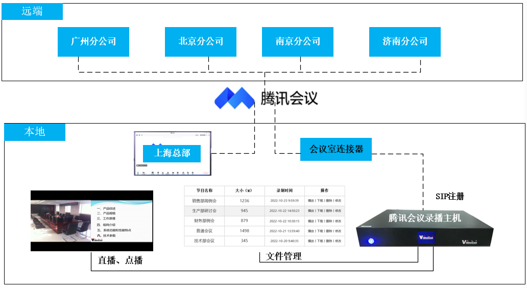· 騰訊會議錄播設備支持注冊到騰訊會議服務器上,并提供在線直播、點播服務。